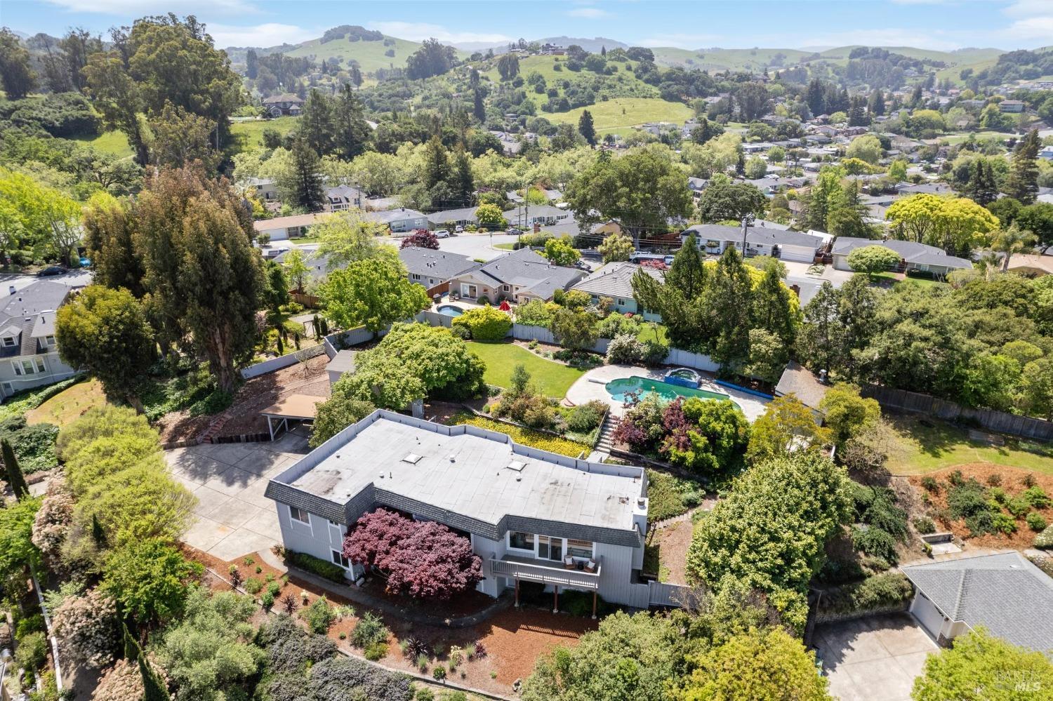 Tucked away on a peaceful 3/4-acre lot in a coveted neighborhood, this unique home blends comfort, character, and versatility. With 3 bedrooms and 3 bathrooms, the main house offers an inviting and functional kitchen, breakfast nook, dining room, and a light-filled living space with sweeping views that bring the outdoors in. Designed for both everyday living and entertaining, the layout flows seamlessly to the backyard, where a sparkling pool and jacuzzi create the perfect setting for relaxing or hosting under the stars. The private ADU with its own entrance, complete with full kitchen, bedroom, and cozy living area, is ideal for guests, extended family, or rental potential. An additional room downstairs provides flexible space for a playroom, home office, or creative studio, while abundant storage (including a huge basement area with wine racks) keeps everything organized. A spacious 2-car garage adds convenience, and the expansive grounds offer plenty of room to roam, garden, or simply enjoy the quiet beauty of the natural setting. With a private feel, modern comforts, and breathtaking views, this truly special home offers a rare opportunity to enjoy space, style, and flexibility in one of Petaluma's most desirable locations.